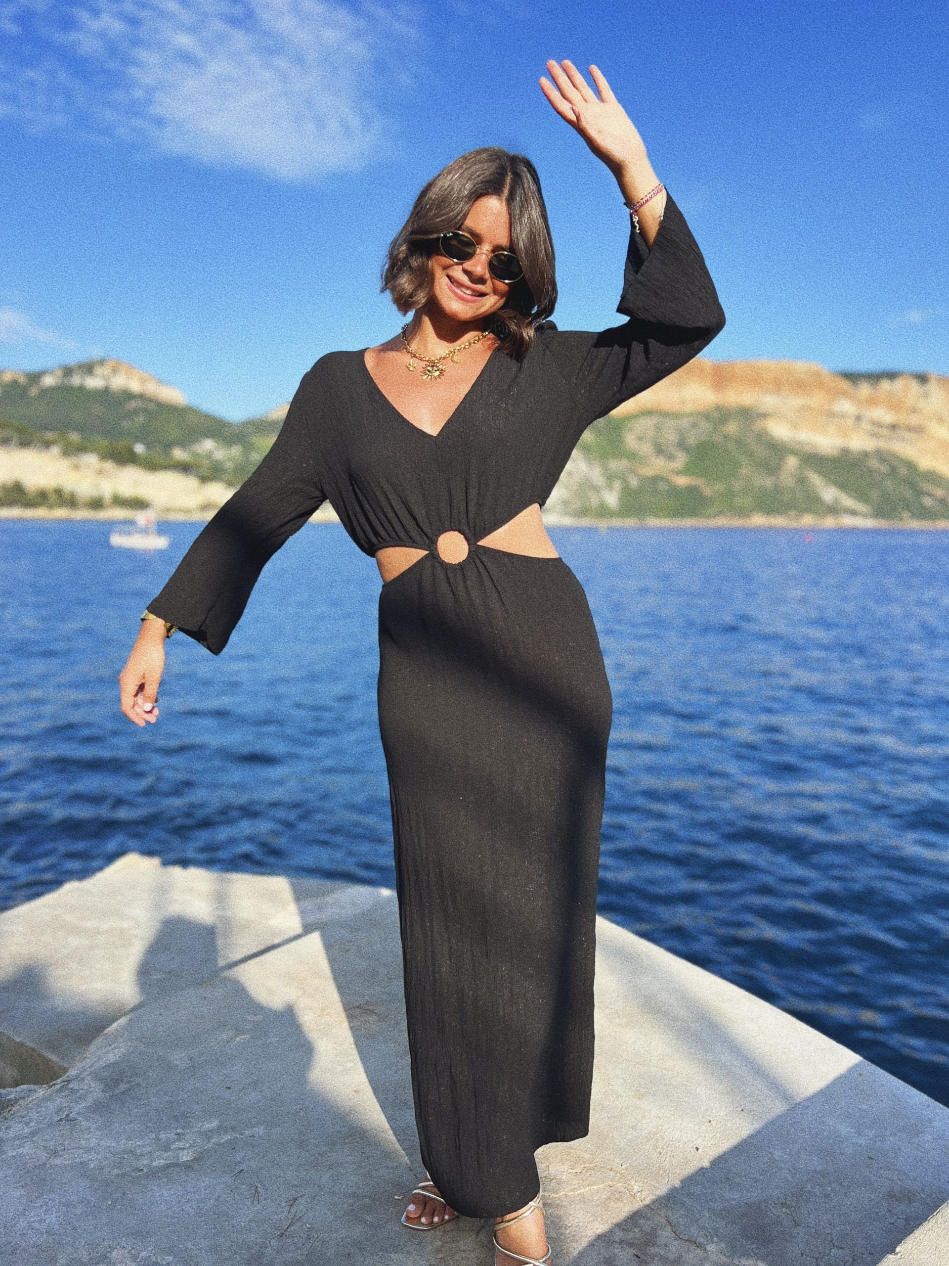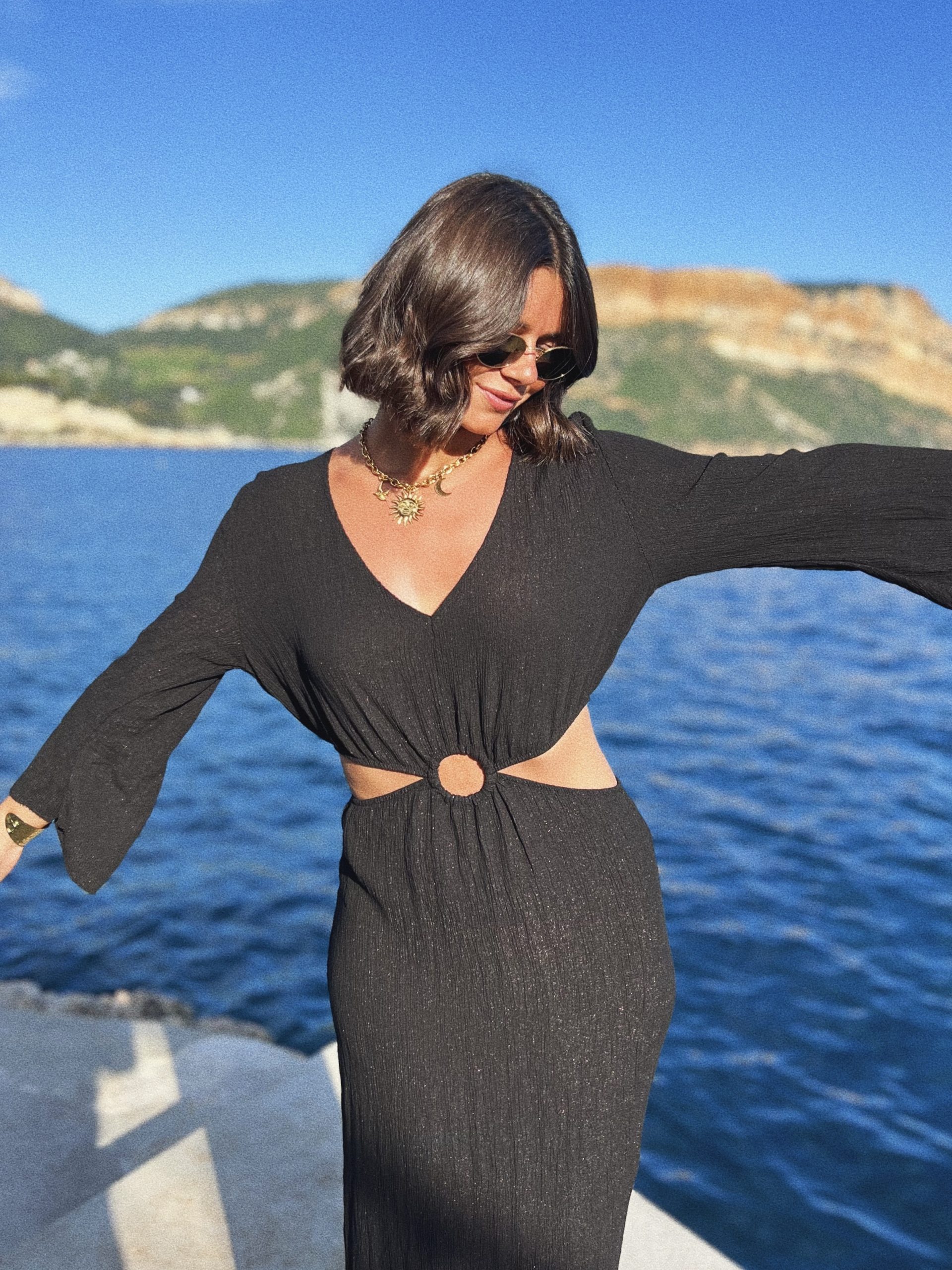 - Elle a un col V très joliment fini, elle a deux ouvertures latérales qui nous laisse le dos ouvert.