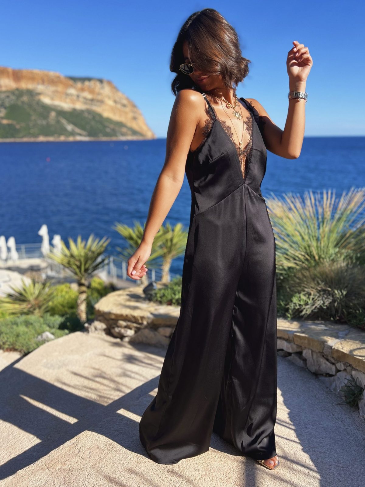 • La Combinaison pantalon est hyper élégante avec son décolleté en V et sa dentelle raffinée. On adore ce look un peu sophistiqué pour les belles occasions!