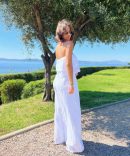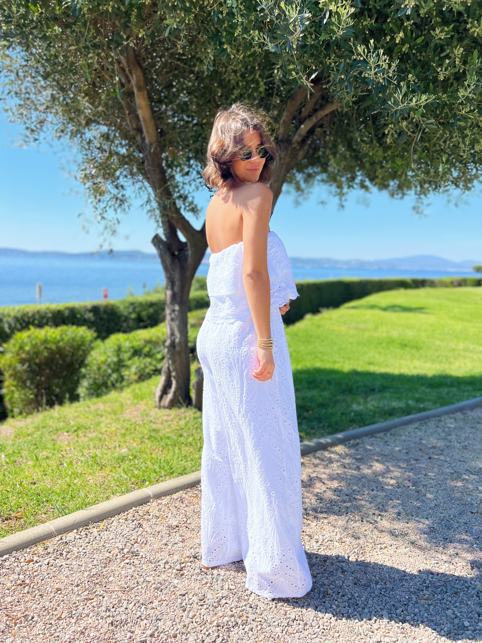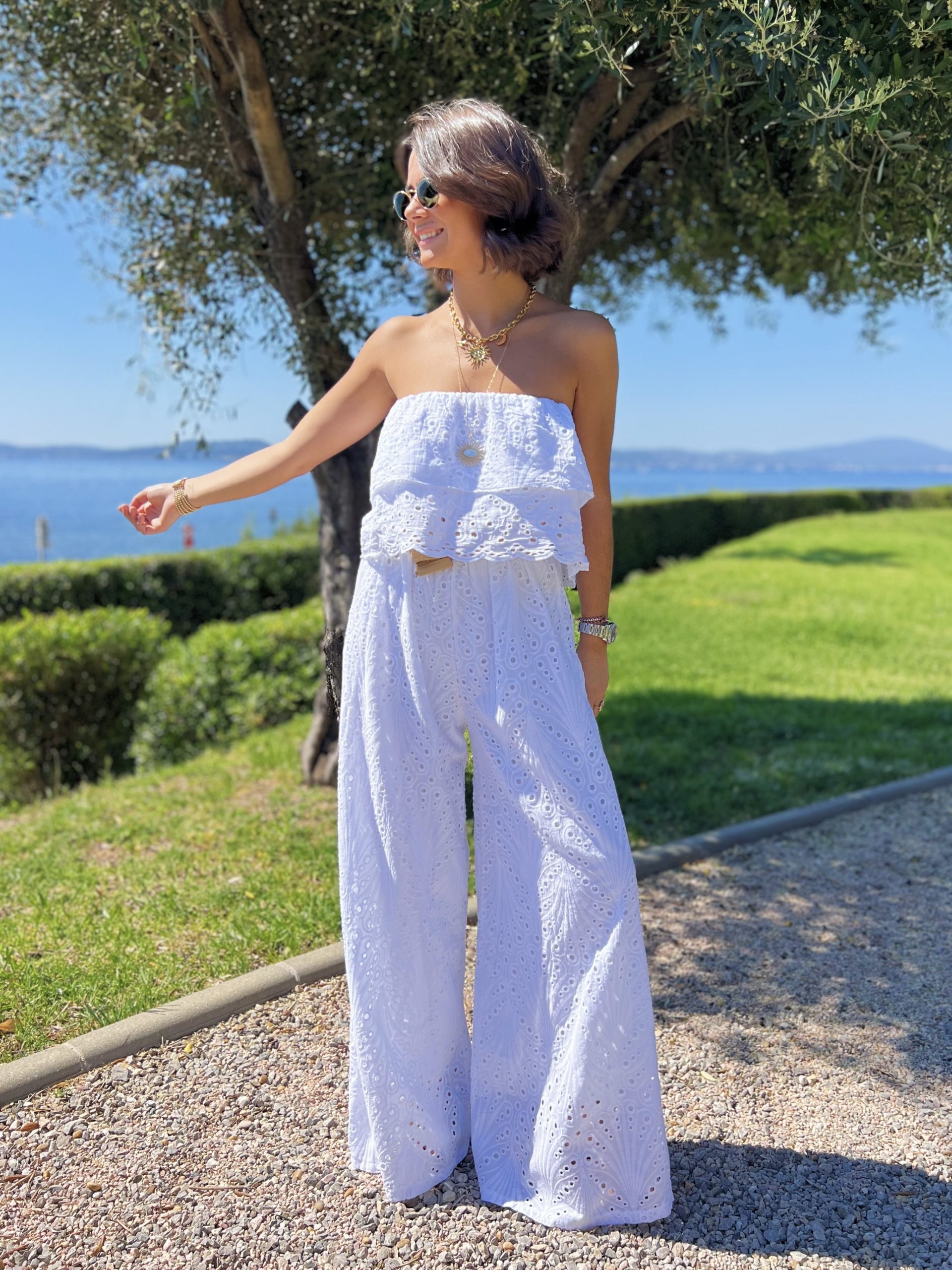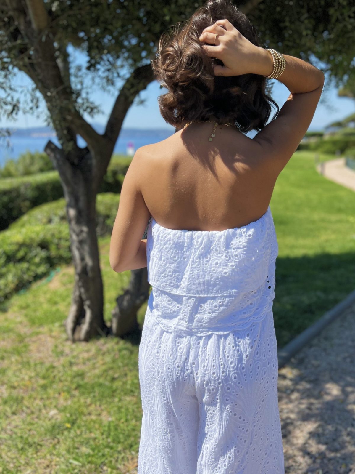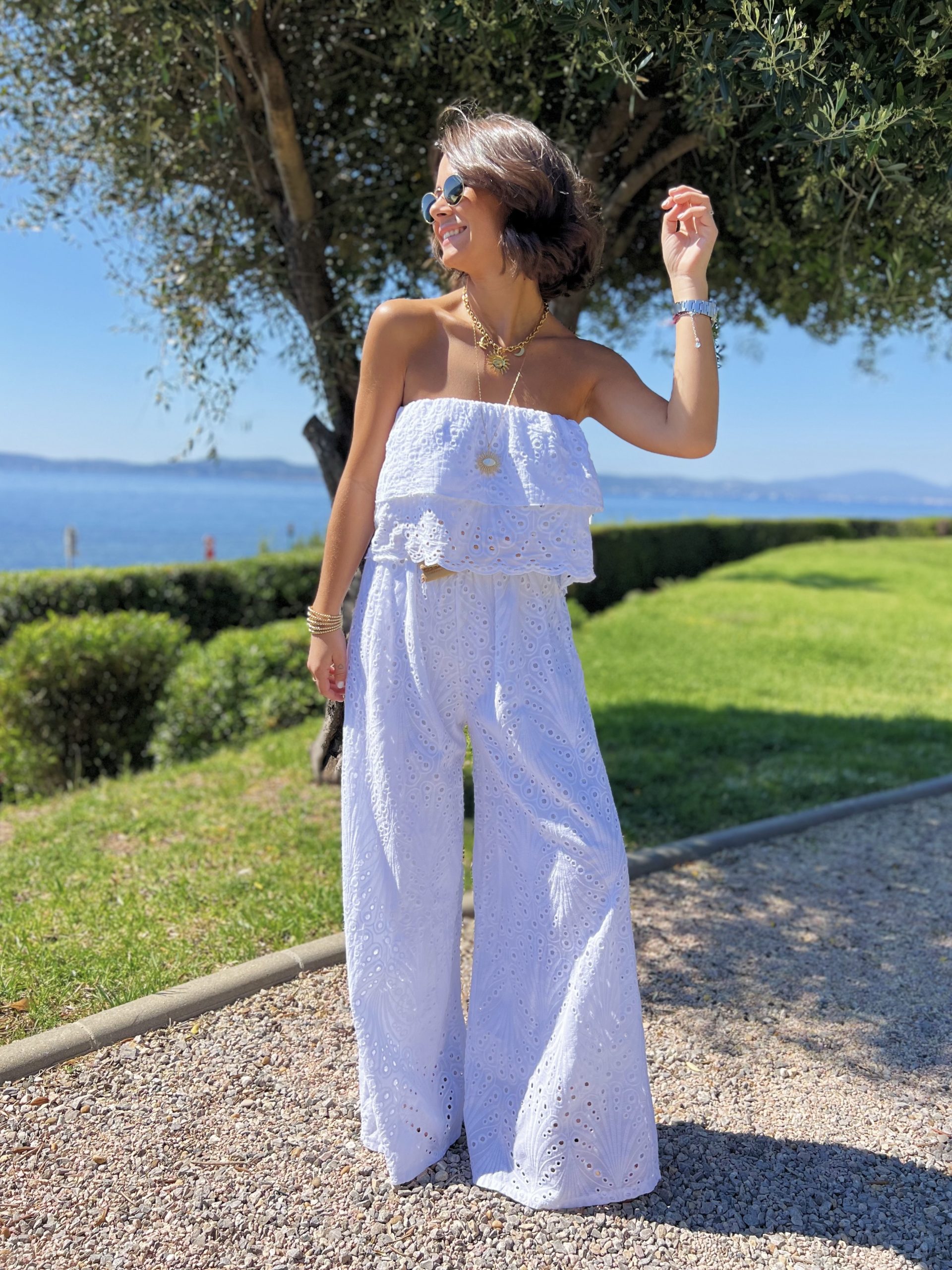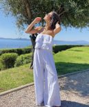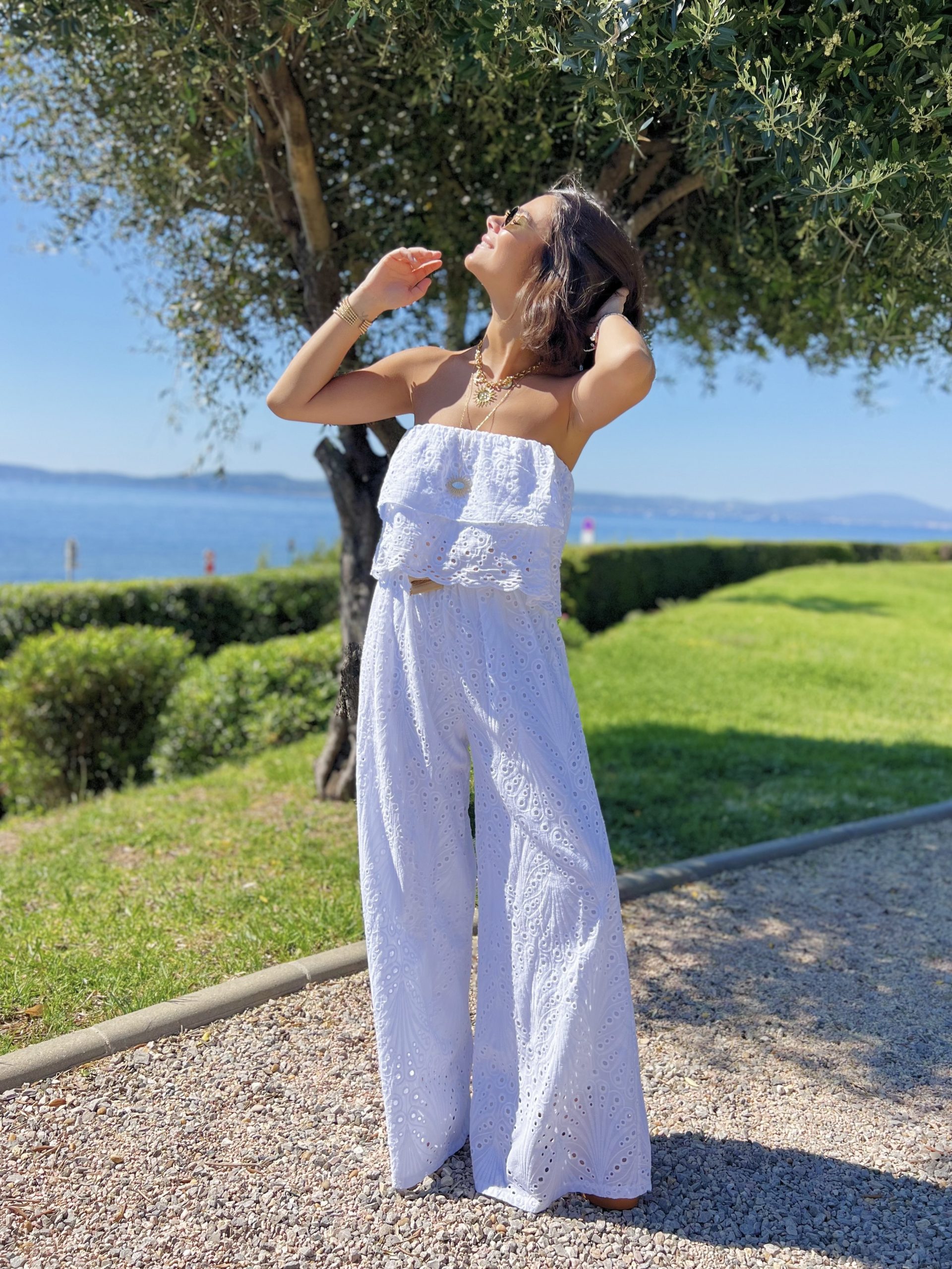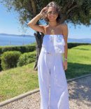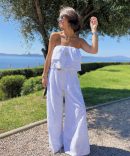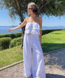 - La combinaison en broderie anglaise avec ses jambes larges et son bustier nous donne une allure fluide et aérienne.