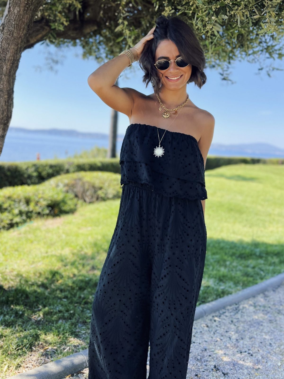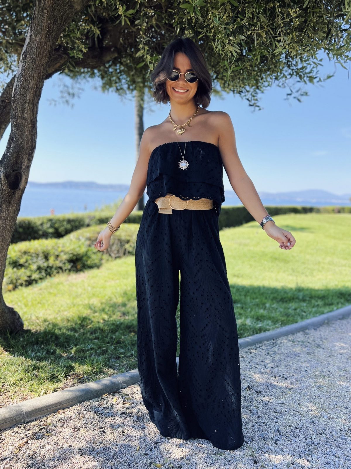 • La combinaison en broderie anglaise avec ses jambes larges et son bustier nous donne une allure fluide et aérienne.