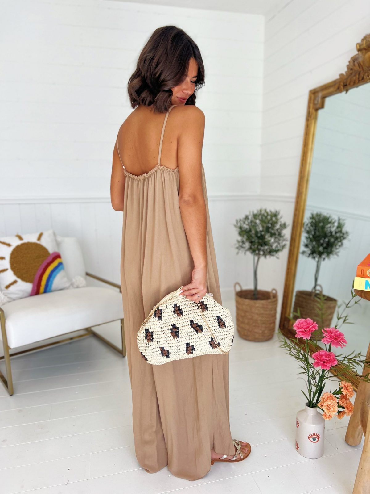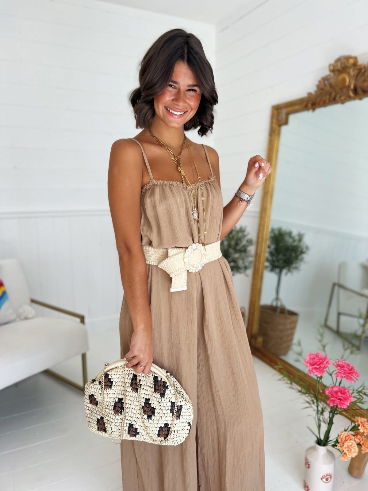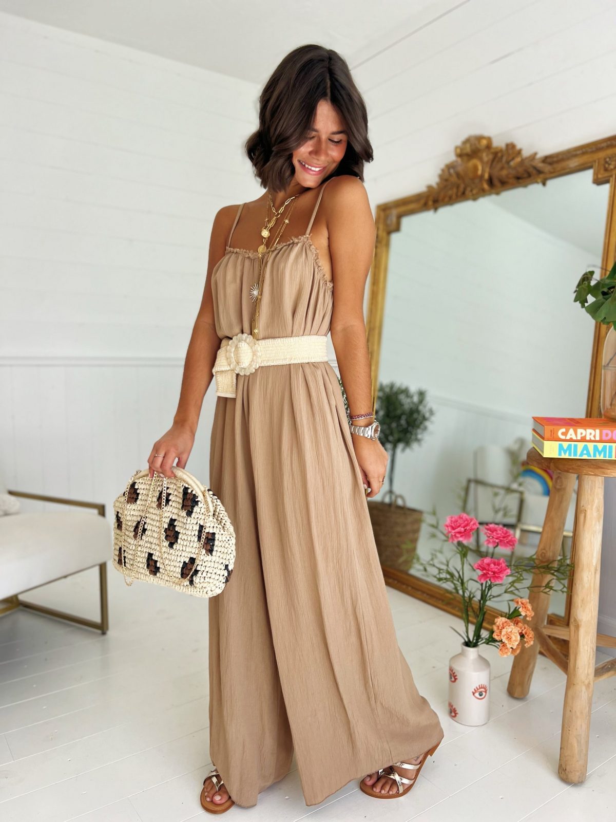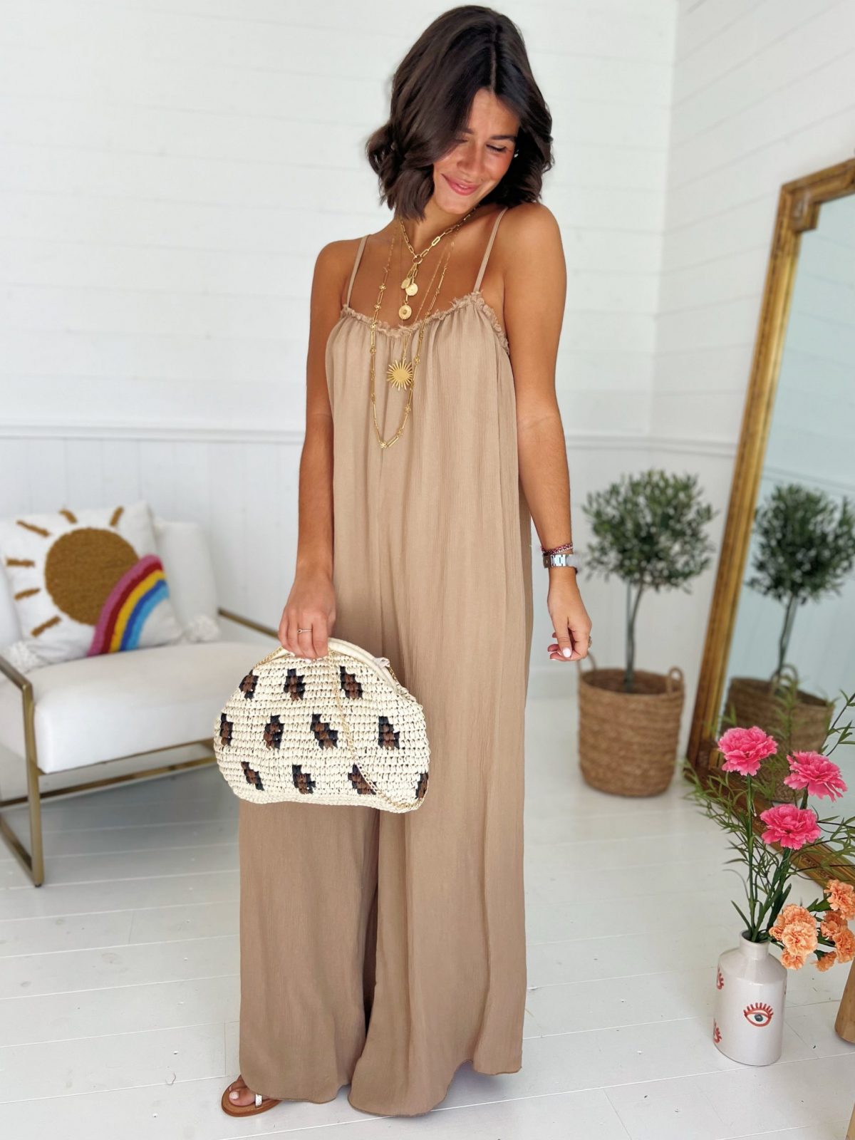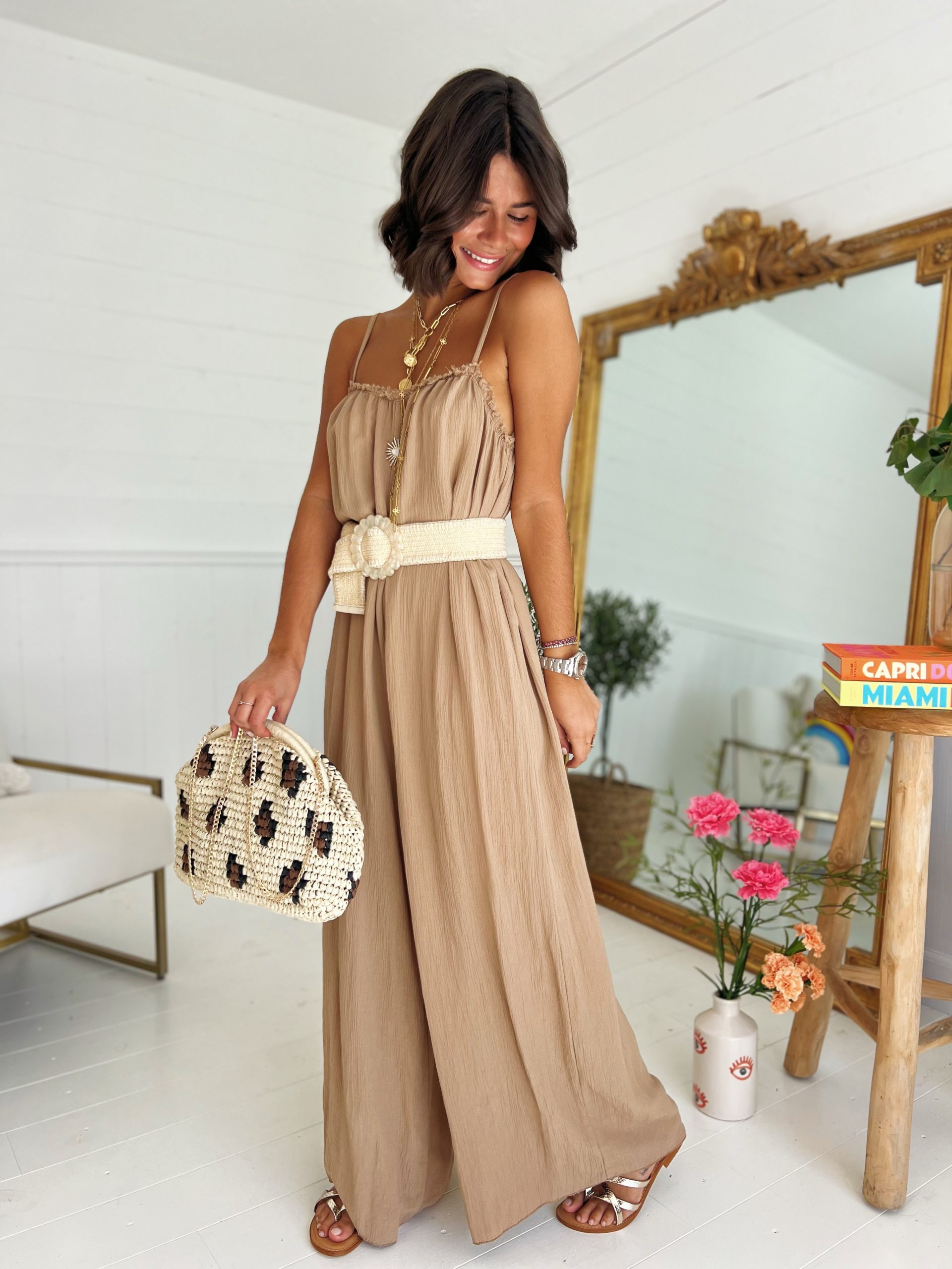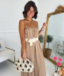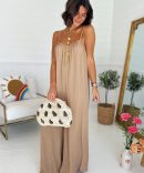 - La combinaison reste une valeur sûre. Celle-ci a des fines bretelles avec les jambes larges.
