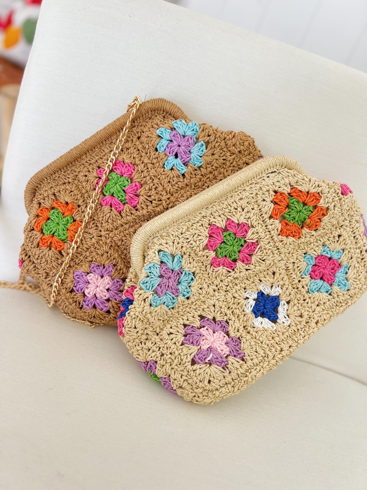 Nous ne pouvons plus nous passer de la pochette en paille, elle est tellement pratique grâce a sa taille et sa chaine doré!
