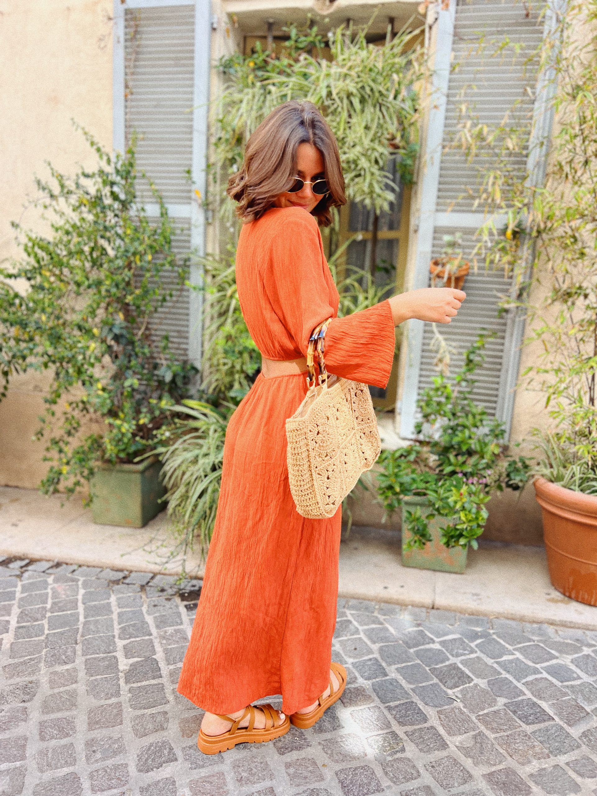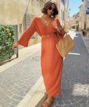 - Elle a un col V très joliment fini, elle a deux ouvertures latérales qui nous laisse le dos ouvert.