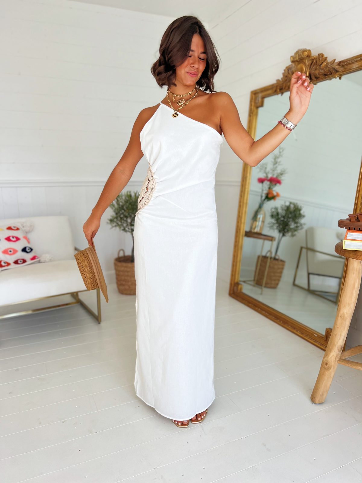 Grand coup de COEUR pour cette magnifique robe blanche en lin et son motif en crochet beige sur le côté. Décolleté une épaule. Elle est hyper originale, chic et branchée!